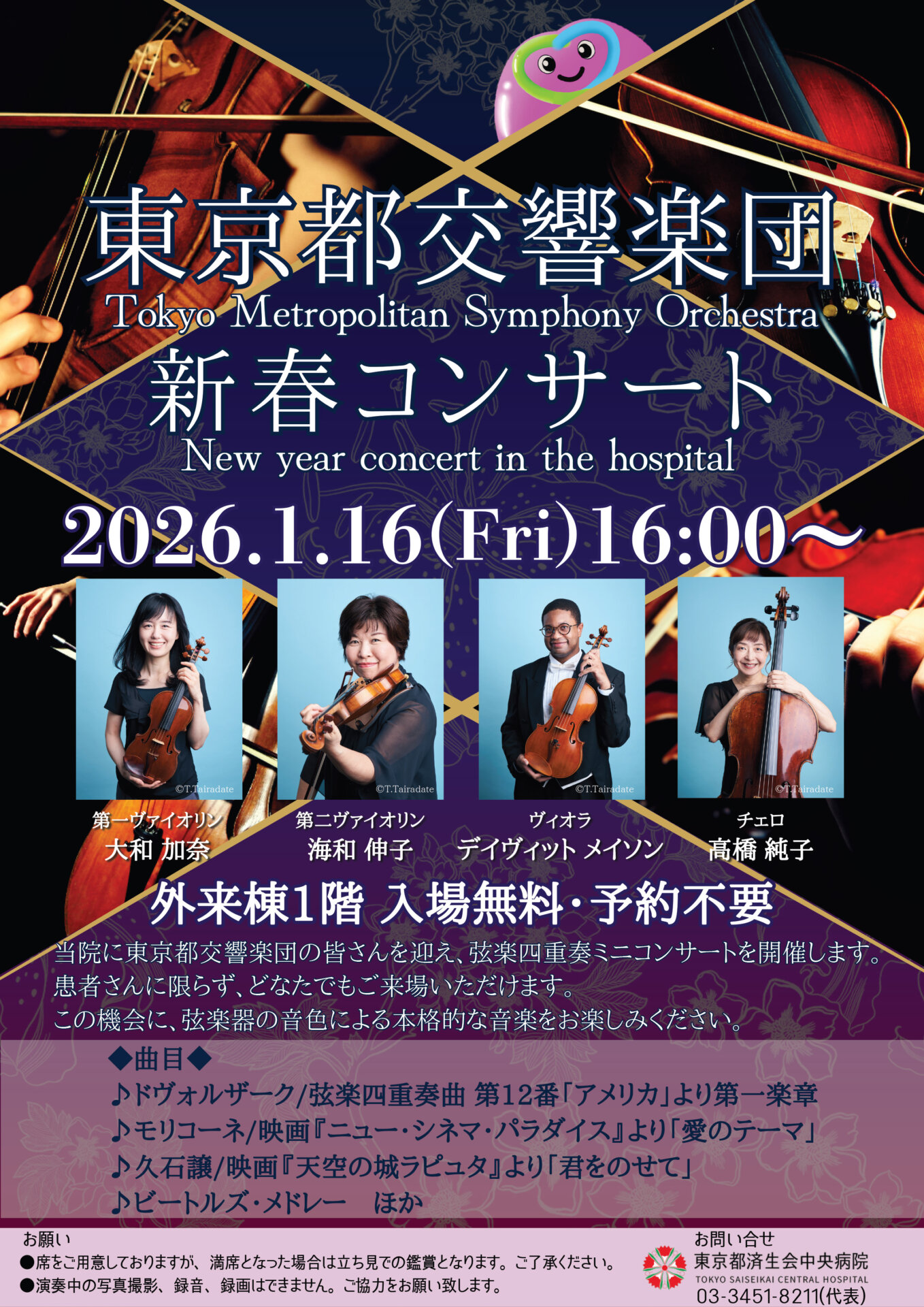 2026年1月16日(金)16時より、当院外来棟1階にて、東京都交響楽団の皆さんを迎え、弦楽四重奏ミニコンサートを開催します。